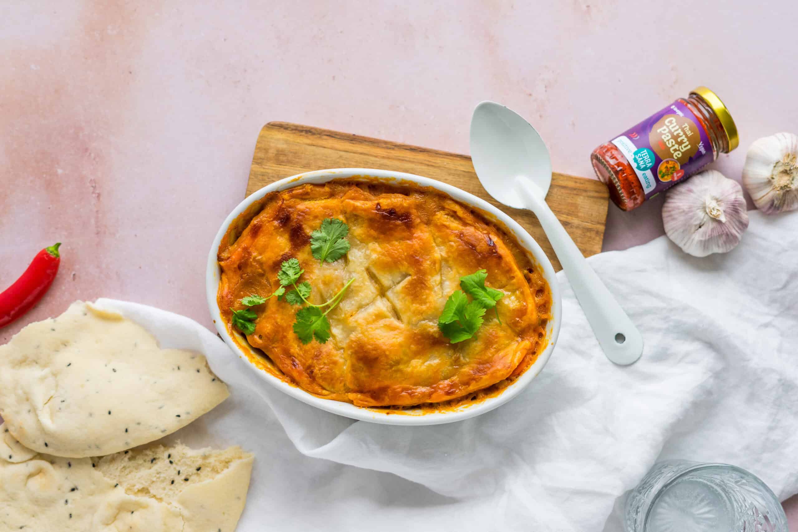 Je maakt een curry pot pie simpelweg door wat maizena aan je curry toe te voegen om het te verdikken. Vervolgens schep je de curry in een mooie ovenschaal, leg je er een dekentje van bladerdeeg overheen en bak je het af. Curry met een twist, dus! En erg lekker met naan (vooral om je bordje mee uit te schrapen).