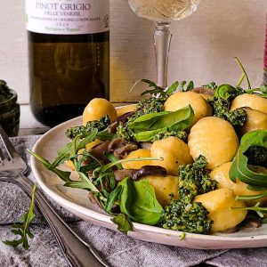 Zin in vegan gnocchi? Maak het met heerlijke paddestoelen in wijnsaus en veganistische rucolapesto. Binnen dertig minuten staat het op tafel. Genieten!